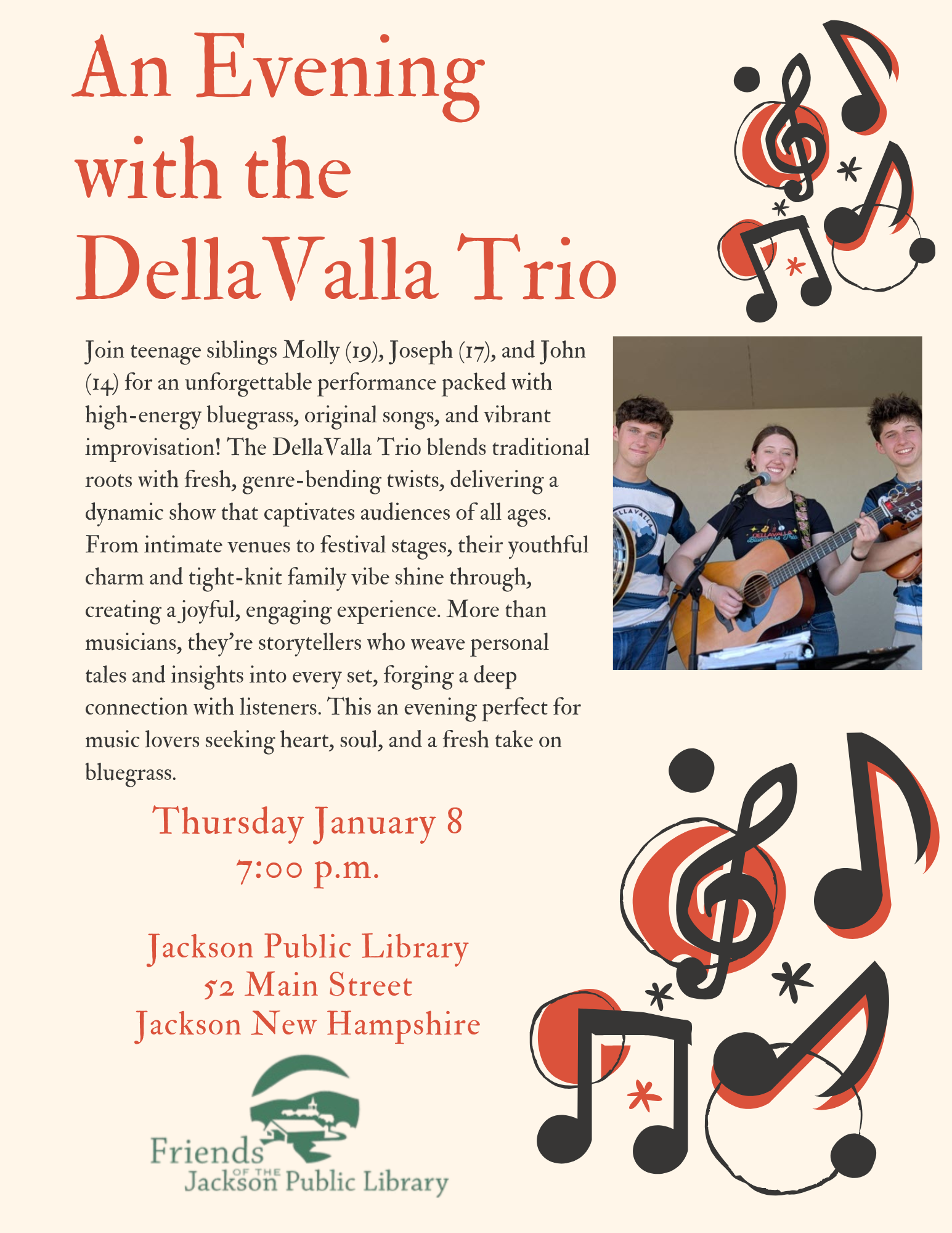 Join teenage siblings Molly (19), Joseph (17), and John (14) for an unforgettable performance packed with high-energy bluegrass, original songs, and vibrant improvisation! The DellaValla Trio blends traditional roots with fresh, genre-bending twists, delivering a dynamic show that captivates audiences of all ages. From intimate venues to festival stages, their youthful charm and tight-knit family vibe shine through, creating a joyful, engaging experience. More than musicians, they’re storytellers who weave personal tales and insights into every set, forging a deep connection with listeners. This is an evening perfect for music lovers seeking heart, soul, and a fresh take on bluegrass.