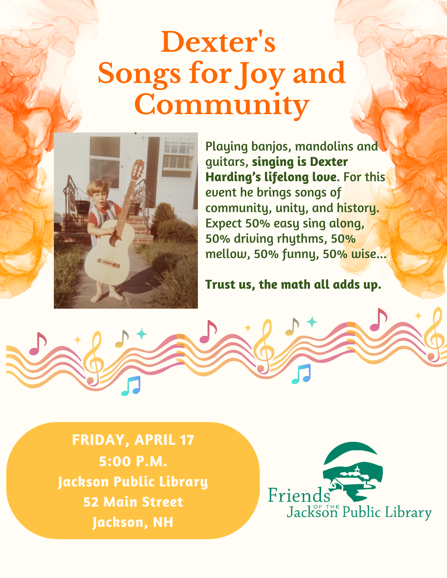 Dexter Harding taught at Jackson Gtammar School for many years. Now a teacher at Tin Mountain, his life is more musical than ever. Playing banjos, mandolins and guitars, singing is his lifelong love. For this event he brings songs of community, unity, and history. Expect 50 percent easy sing along, 50 percent driving rhythms, 50 percent mellow, 50 percent funny, 50 percent wise. Trust us, the math all adds up.